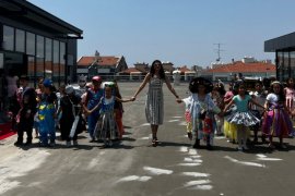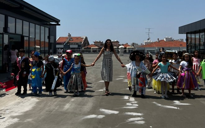 Karşıyaka Bostanlı Mustafa Reşit Paşa İlkokulu'nda 1-E sınıfı öğrencileri geri dönüşümün dikkatini çekmek için atık malzemelerden elbiseler yaptı.