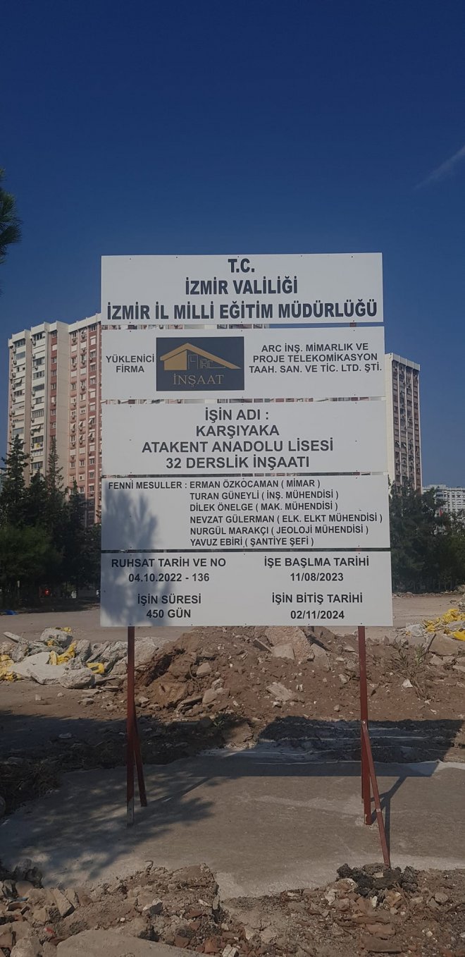 Yıkılma kararı ve yıkılma aşamasının da kamu oyunda büyük tepkilere neden olan, protestolar yapılan Atakent Anadolu Lisesi'nin yeniden yapılmasının programlandığı gibi yürüdüğünü belirten Karşıyaka İlçe Milli Eğitim Müdürü Kadir Kadioğlu, sosyal medyadan "Karşıyaka Atakent Anadolu Lisesi söz verdiğimiz gibi 32 derslikli inşaatımız başladı. Hayırlı olsun" açıklamasını yaptı.