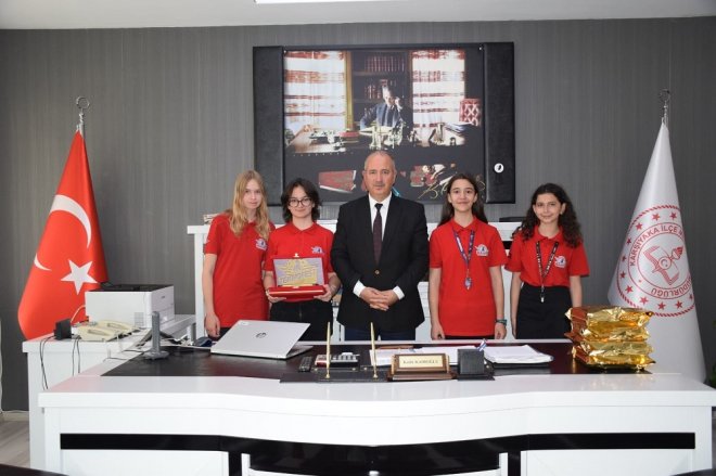 Karşıyaka'ya Türkiye Şampiyonluğu getiren Karşıyaka Atakent Erdoğan Kibarer Ortaokulu Öğrencileri Karşıyaka Milli Eğitim Müdürü Kadir Kadıoğlu'nu makamında ziyaret etti. İlçe Milli Eğitim Müdürü Kadir Kadıoğlu, şampiyon öğrencileri ve öğretmenlerini kutlayıp, onlara hediye takdim etti.