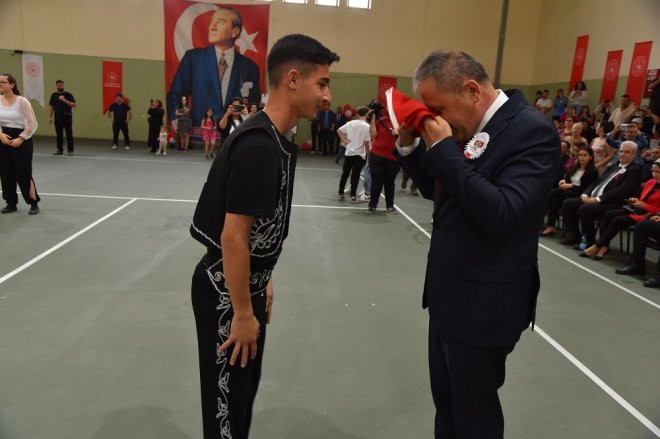 Konuşmanın ardında ulusal ve uluslararası başarılı sporculara ve İlçe Milli Eğitim Müdürlüğünce düzenlenen çeşitli yarışmalarda dereceye giren öğrencilere Kaymakam Demir, Belediye Başkanı Ünsal, komutan Koçaş ve Başsavcı San tarafından ödülleri verildi.