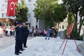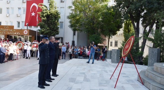 Karşıyaka Hükümet Konağının bahçesindeki Atatürk Anıtına çelenk sunumu ile başlayan törene; Karşıyaka Kaymakamı Özkan Demir, Ege Deniz Bölge Komutanı Dz.Kd.Alb. Ertan Engerek, Karşıyaka Belediye Başkanı Dr. Cemil Tugay, Karşıyaka Başsavcısı Ali Rıza San, Kamu kurum yöneticileri, siyasi partilerin ve STK’ ların yönetici ve temsilcileri, gaziler ve Karşıyakalılar katıldı.