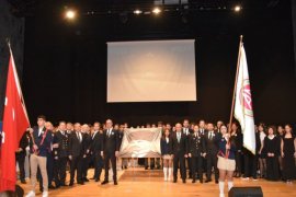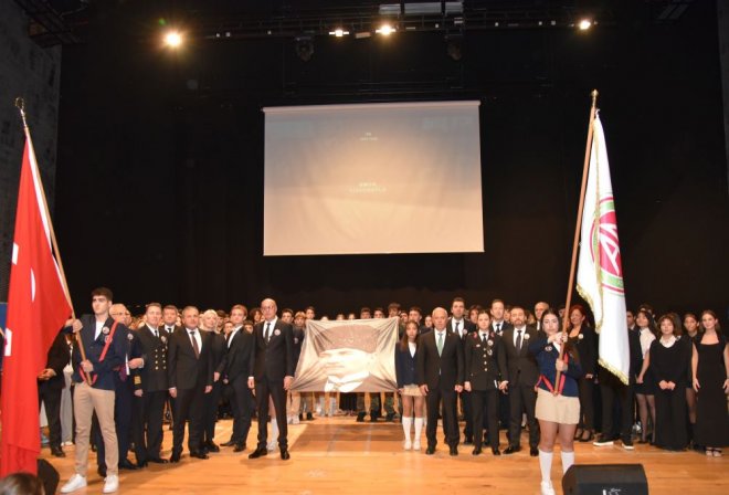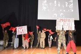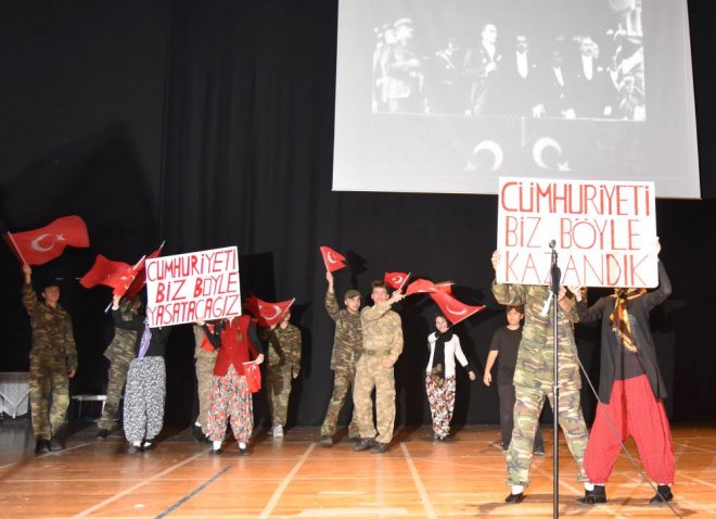 Öğrencilerin “Cumhuriyeti Biz Böyle Kazandık”, “Cumhuriyeti Biz Böyle Yaşatacağız” dövizleri ile sahnedeki gösterisi sırasında salonda büyük alkış koptu.