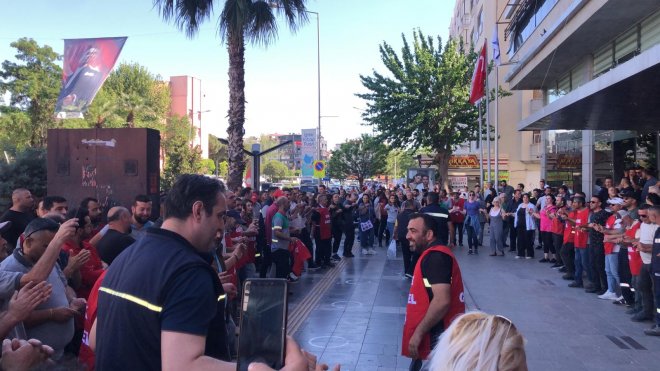 Saat 15.00'de belediye binası önünde toplanan ve Belediye Başkanı B.Yıldız İşçimenler Ünsal ile konuşmak isteyen işçiler bina önünde oyun havası oynayarak vakit geçirdi.