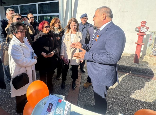 Karşıyaka Kaymakamı Özkan Demir, “25 Kasım Kadına Yönelik Şiddete Karşı Uluslararası Mücadele Günü vesilesiyle hak ve özgürlüklerinden yararlanma noktasının cinsiyet eşitliğini sağlandığı bir dünya temenni ederken şiddete "sıfır tolerans" diyoruz” dedi.
