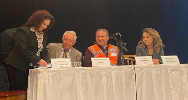 Karşıyaka Belediyesi Ahmet Piriştina Kültür Merkezi'nde düzenledikleri panelin ilk konuşmacısı Jeofizik Yüksek Mühendisi Prof. Dr. Zafer Akçığ; depremin ne olduğu, nasıl meydana geldiği, İzmir’in Depremselliği. aktif fay hatları, mevcut zemin yapısı, depremin zeminde yaratacağı deformasyon gibi konularda detaylı bir sunum yaptı.
