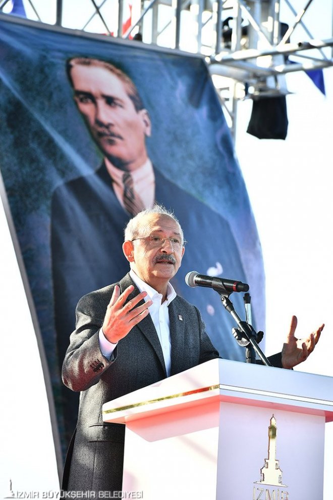 İzmir Büyükşehir Belediye Başkanı Aziz Kocaoğlu'nun 397 yıl hapisle yargılandığını hatırlatan Kemal Kılıçdaroğlu, "Sonunda beraat etti. Bir Büyükşehir Belediye Başkanı düşünün, tüm azmini ve kararlığını bir kente vermiş, devletin tüm engellemelerine rağmen İzmir’i bir yüzük gibi tüm dünyaya takdim etmiş. Siz bu belediye başkanını 397 yılla yargılıyorsunuz. Aklın almayacağı bir şey! Bir başkan haksız yere 397 yılla yargılanıp beraat ediyorsa bu meydan demokrasi sözcüğünü hak ediyordur. Öyle bir noktaya geldik ki , demokr asi ayaklarımızın altından kaydı, giderek kan kaybediyor. Ama Türkiye bir istihbarat devletine dönüştü. Ne demek bu? Herkesi fişlemek demek. Herkesin telefonlarını dinlemek demek. Hele rakiplerin telefonlarını dinlemek, bir kişiye rapor vermek demek. Bunları ben söylemiyorum. Allah konuşturuyor, arada bir söylüyor. Erdoğan söylüyor; 'partimizin genel merkezinde önümüze konulan tüm adaylarımıza GBT denilen soruşturmayla tepeden tırnağa mili istihbarla inceledik' diyor. Devletin istihbaratının başka işi mi yok? Akılla, mantıkla, demokrasiyle bağdaşır bir yönü var mı bunun? Devlet ayrıdır, siyasi iktidar ayrıdır. Siyasi iktidar 5 yıllığına devleti yönetmeye taliptir. Siyasi iktidar geçicidir, devlet bakidir” ifadelerini kullandı.