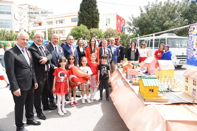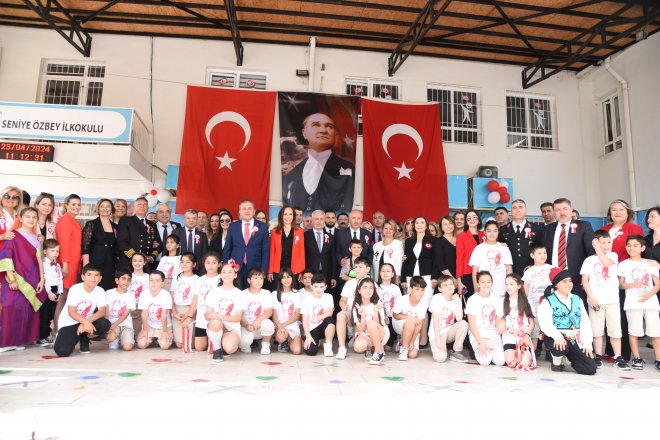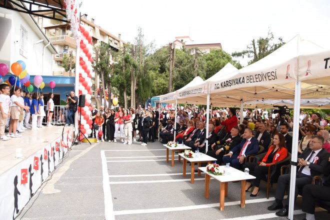Çelenk töreninden sonra kutlamalar Mehmet Seniye Özbey İlkokulunda düzenlenen etkinliklerle devam edildi. Buradaki törene Karşıyaka Kaymakamı Özkan Demir, Karşıyaka Belediye Başkanı Yıldız Ünsal, Ege Deniz Bölge Komutanı Deniz Albay Yetkin Koçaş, Karşıyaka Cumhuriyet Başsavcısı Ali Rıza San, Adalet Komisyonu Başkanı Mehmet Özcan, İlçe Emniyet Müdürü Ercan Kaçanoğlu, İlçe Jandarma Komutanı Ahmet Karaman, İlçe Milli Eğitim Müdürü Kadir Kadıoğlu, Karşıyaka Belediye Başkan yardımcıları Berkhan Alptekin ve Can Özlü, Kızılay Karşıyaka Şube Başkanı Kamil Karadeniz, AK Parti İlçe Başkanı Selahattin Köse, CHP İlçe Başkanı Levent Güçlü, siyasi parti ve STK temsilcileri, kurum yöneticileri, öğretmen ve öğrenciler katıldı.