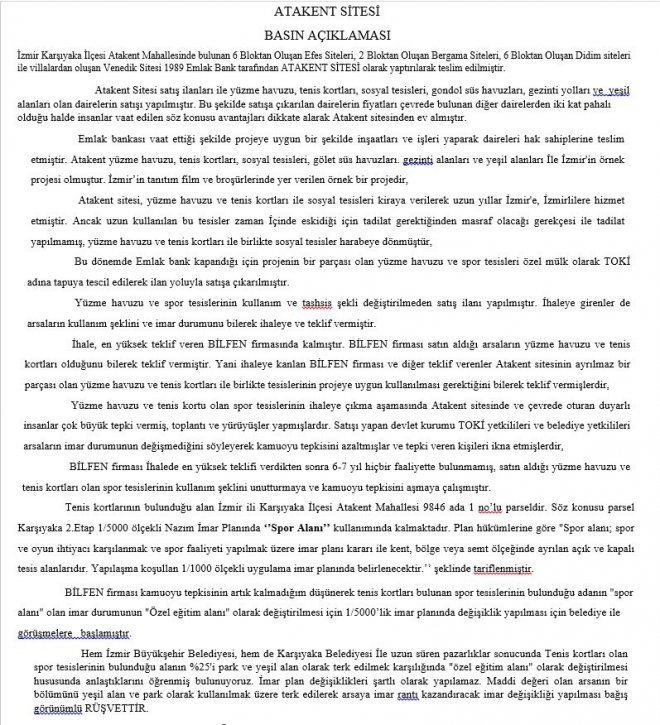 İzmir Büyükşehir Belediyesi ve Karşıyaka Belediyesi spor alanı olan arsayı bu vasfı ile ihaleden alan BİLFEN firmasına Atakent sitesi projesine aykırı olarak imar değişikliği yaparak çok büyük rant kazandırmaktadır.