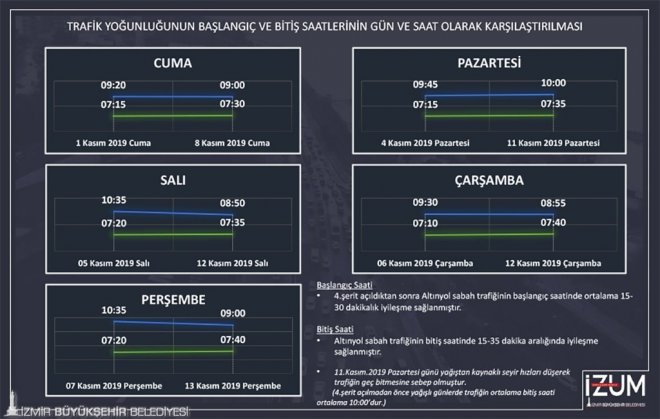 İnşaatın sürdüğü 1 Kasım 2019 Cuma günü trafik sıkışıklığı sabah 7.15’te başlarken, 8 Kasım 2019 Cuma günü yapılan ölçümler sıkışıklığın başlama saatinin 7.30’a kaydığını belirtiyor. Aynı şekilde trafik sıkışıklığının bitiş saati de 9.20’den 9.00’a geriledi. Yağışlı geçen 4 Kasım Pazartesi günü hariç diğer dört günde trafik sıkışıklığı daha geç başlayıp, akşam saatlerinde de daha erken bitiyor. Çalışmaların noktalanmasından sonraki beş gün karşılaştırıldığında üç şeritten dört şeride çıkan yol nedeniyle sabah saatlerinde 15-30 dakika, bitiş saatlerinde ise 15-35 dakika arasında iyileşme sağlandı.