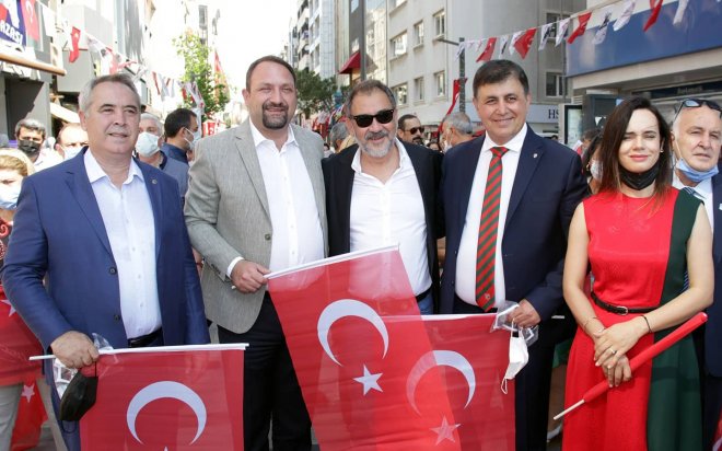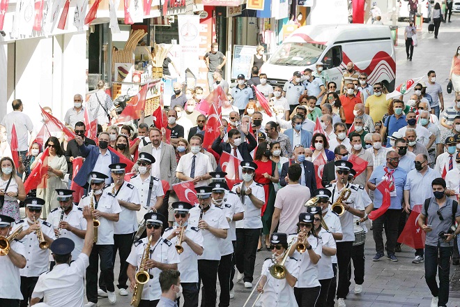 Daha sonra Karşıyaka çarşı korteji Karşıyaka Belediye Bandosu eşliğinde yürüdü.. Her iki törene, Karşıyaka Kaymakamı Ali Rıza Çalışır, Karşıyaka Belediye Başkanı Dr. Cemil Tugay ve eşi, Dışişleri Bakanlığı İzmir temsilcisi Naciye Gökçen Kaya, Çiğli Belediye Başkanı Utku Gümrükçü, Karşıyaka Spor Kulübü Başkanı Turgay Büyükkarcı, Cumhuriyet Halk Partisi Karşıyaka İlçe Başkanı M. Serdar Koç, İzmir Barosu Başkanı Özkan Yücel katıldı.
