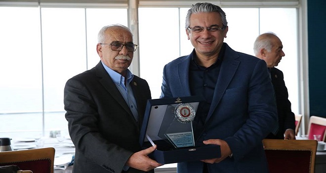 Karşıyaka Muhtarlar Derneği Başkanı Fuat Pusat, Karşıyaka Belediye Başkanı Hüseyin Mutlu Akpınar'a hizmetleri nedeniyle plaket takdim etti.