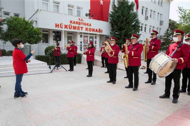 Meclis üyeleri ve vatandaşların da katıldığı törende, Karşıyaka Belediye Bandosu eşliğinde hep bir ağızdan 10. Yıl Marşı okundu. Başkan Tugay daha sonra iki çocuk misafiriyle birlikte, KKTC’nin Girne Belediye Başkanı Nidai Güngördü’ye Zoom üzerinden bağlandı. Temsili bir buluşma gerçekleştiren başkanlar, karşılıklı olarak iki ülke çocuklarının bayramını kutladı. Ayrıca Belediye Bandosu, faklı noktalarda mini konserler vererek bayram coşkusunu tüm ilçeye yaydı.