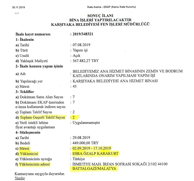 AK Parti Karşıyaka İlçe Başkanı İsmail Çiftçioğlu, ihaleye ilişkin tüm bilgileri, belgeleriyle birlikte kamuoyuna açıkladı. Çiftçioğlu, “Belediyenin zemin katında onarım işleminin yapılması için ihale 7 Ağustos 2019 tarihinde yapıldı. Sözleşme ise, 29 Ağustos’ta imzalandı. Tadilatın da 17 Ekim’de tamamlanması gerekiyordu. Daha önce, tadilat işleminin çok maliyetli olduğunu ve belediyenin parasının çarçur edildiğini belirtmiştik. Karşıyaka Belediyesi ise, 14 Kasım’da açıklama yaparak, ihalenin tüm öğeleriyle 400 bin TL bedelle bir müteahhit firmaya verildiğini belirtmişti. Ancak ihaleyle ilgili belgelere ulaştık ve tadilat için harcanan bedelin çok daha yüksek olduğunu gördük. Sadece tadilatın belediyeye olan onarım maliyeti 529 bin 820 TL’dir. Sayın Tugay, aradaki 129 bin 820 TL’lik farkı gizlemiştir”dedi.