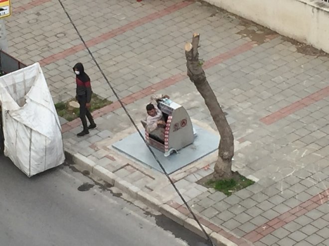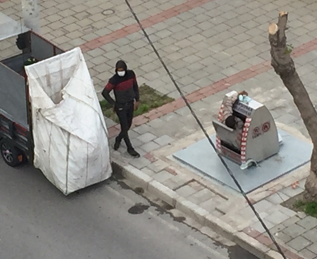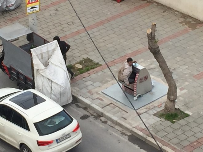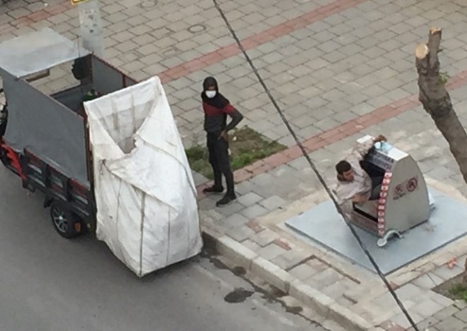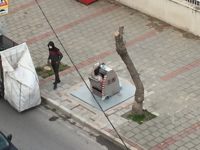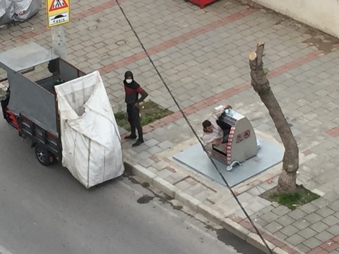 Karşıyaka Belediyesi de çevre kirliliğinin önüne geçebilmek için yer altı konteynerlerini çoğalttı. Bu dönem belediye yer altı konteynerlerinin ağızlarını daha güvenlikli ve girilmesi daha zor olarak yaptırdı. Bunları da kentin belirli yerlerine koymaya başladı. Karşıyakalılar “Çevre kirliliğinin önüne geçilecek” derken, çöp toplayıcılar bunun da formülünü buldu. Birisi otomatik kapağı tutarak ikinci kişinin içine girmesini sağladı. Çöp kutusuna giren alttan aldıklarını üste çıkardı ve arkadaşına vererek içinde, işine yarayanları dışarıya çıkardı. Sonra da yine arkadaşının yardımıyla dışarıya çıktı.