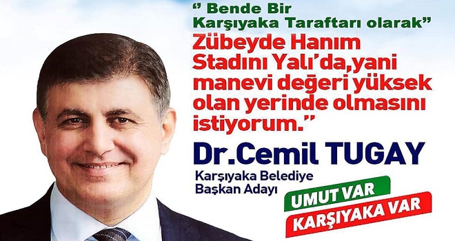 Tugay, Karşıyaka Stadı'nın Yalı'ya, yıkıldığı yere yapılması için elinden gelen herşeyi yapmaya hazır olduğunu ifade ederek, "Bu tezimi ilk günden bu yana savunan bir kişiyim. Ne yazık ki bazı kişiler Karşıyaka Spor Kulübü ve Zübeyde Hanım Stadı üzerinden siyaset yapmaya çalışıyor ve insanları karalıyor" dedi.