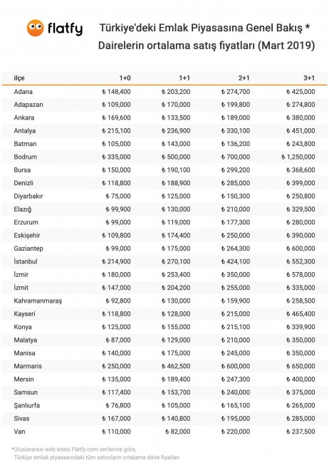 Flatfy tarafından yayınlanan raporların ilki yukarıda yer alan ve ülkemizin neredeyse her bölgesinden şehirlerin oluşturduğu ortalama satılık daire fiyatları raporudur. Raporda toplam 27 farklı şehre ilişkin fiyatlar yer almaktadır ve bu fiyatlar, Flatfy üzerinde mart ayında yayınlanmış olan emlak ilanlarının tamamının ortalama fiyatları hesaplanarak hazırlanmıştır.