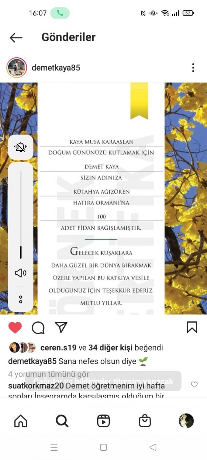 Demet Kaya, oğlunun yaş gününe katılacak olan, eş dost, akraba, kendi arkadaşlarıyla oğlunun arkadaşlarının ailelerine çağrıda bulunup; “Gelecek kuşaklara daha güzel bir dünya bırakmak üzere oğluma yaş günü hediyesi yollamayın, getirmeyin. Sizler gelin ancak oğlum için alacağınız hediyenin parasını yanan ormanlara fidan alınması için bağışlayın. Bu beni ve oğlumu daha da çok mutlu edecektir” dedi.
