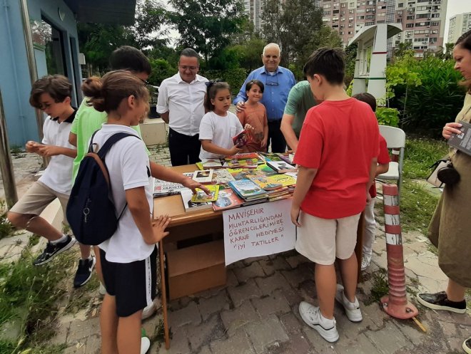 Karşıyaka Mavişehir Mahalle Muhtarı Gürol Küçükgörür, her yıl karnesini alan çocukları hem sevindirmek hem de tatilde okuma alışkanlığı edindirmek için kitap hediye ediyor.