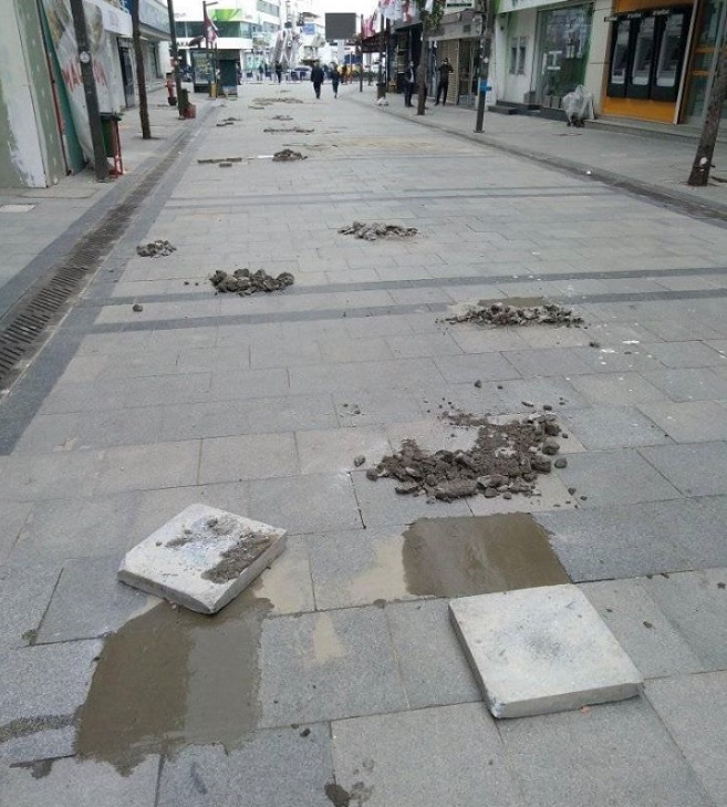 Karşıyaka Çarşı (Kemalpaşa Caddesi) zeminde bozuk ve kırık olan taşları değiştirip tamiratını yapan Karşıyaka Belediyesi Ulaşım Şube Müdürlüğü çalışanları tamiratın kısa sürede tamamlanacağını ve çarşıda eksik ve kırık taş kalmayacağını ifade ettiler.