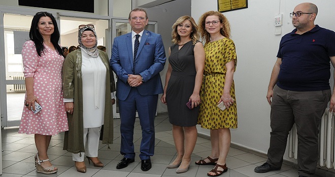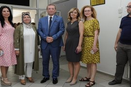 Karşıyaka Halk Eğitim Merkezi Müdürü Ebru Yılmaz, kurumun merkez binasında açılanm yıl sonu sergisine katılarak açılışını yapan Karşıyaka Kaymakamı Ali Rıza Çalışır ve eşi Güler Çalışır ile birlikte sergiyi gezerek gerekli bildileri verdi.