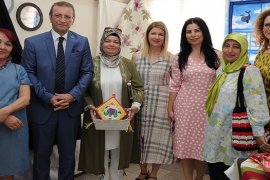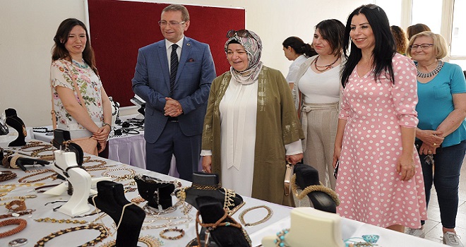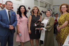 Karşıyaka Halk Eğitim Merkezi Müdürü Ebru Yılmaz, Kaymakamı Ali Rıza Çalışır ve eşi Güler Çalışır'a da öğretmen ve kursiyerlerin yaptığı eserlerden çeşitli hediyeler taktim etti.