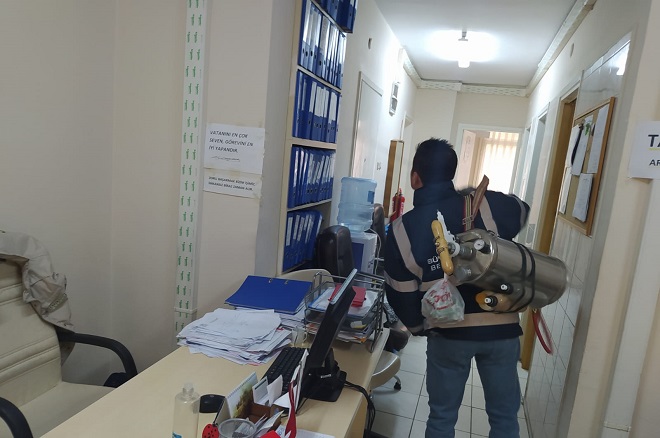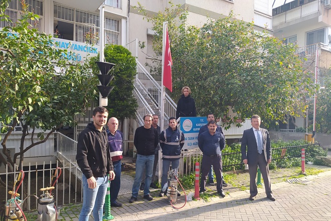 7/24 denetlemelere çıkan ve bu nedenle de çalışma alanlarının temizliğine de dikkat eden Karşıyaka İlçe Tarım ve Orman Müdürü İsmail Emetli, İzmir Büyükşehir Belediyesi'nden destek alarak dezenfekte ekibini müdürlüğe getirtti.