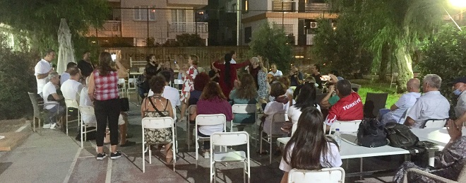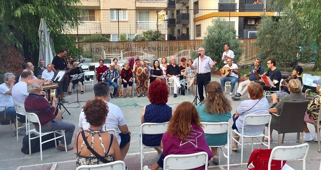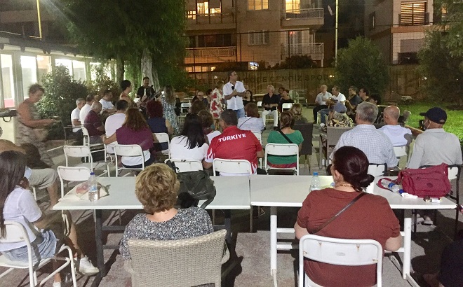 Aşısını olmayanların alınmadığı yeni dönemin ilk koro çalışmasını mahalle halkının isteği üzerine mini bir konsere çeviren Karşıyaka Sanat Derneği TSM Korosu şefi, ülkemizin en ünlü kanun sanatçısı Erol Gönüldaş yönetiminde yeni sezona muhteşem bir giriş yapıldı.