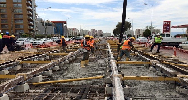 390 milyon liralık Konak ve Karşıyaka tramvaylarıyla birlikte, Büyükşehir Belediyesi'nin Bakan Kocaoğlu döneminde raylı ulaşım için gerçekleştirdiği yatırım miktarı 4 milyar 534 milyon lirayı buldu.Kent içi trafiğe nefes aldırmak amacıyla hazırlanan Karşıyaka-Konak tramvay projelerinin atölye-destek bina inşaatları ile araçlarının yapım çalışmalarını sürdüren İzmir Büyükşehir Belediyesi, güzergahın alt yapı deplasmanları biten bölümlerinde ray döşeme çalışmalarına başladı. Cahar Dudayev Bulvarı’nda ilk ray döşeme işlemi, İzmir Büyükşehir Belediye Başkanı Aziz Kocaoğlu'nun da katıldığı bir törenle gerçekleştirildi.Geçtiğimiz ay 400 milyonluk Fuar İzmir'i açtıklarını hatırlatan Başkan Aziz Kocaoğlu, "Bugün yine 400 milyonluk bir projenin temelini atıyoruz. İzmir Büyükşehir Belediyesi, şu anda sadece raylı sistem yatırımı olarak 80 kilometrelik proje yürütüyor. 30 km torbalı hattı, 26 km Selçuk hattı, 24 km Karşıyaka ve Konak tramvayı ile birlikte toplam 80 kilometre. 100 kilometre de şu anda çalışıyor, 180 olacak" dedi.