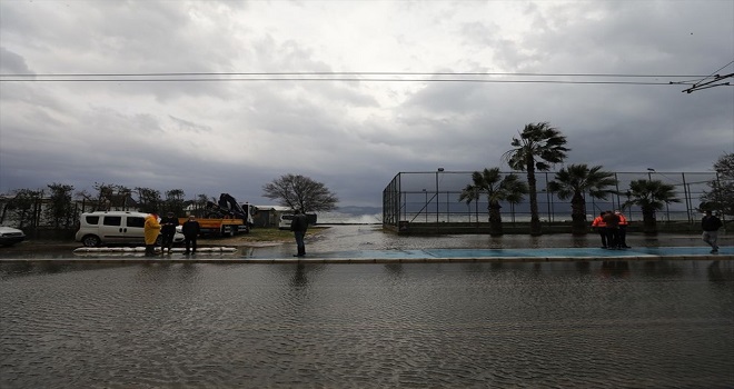 Karşıyaka Yelken Tesisleri önünde lodosunda etkisiyle deniz suyunun taşması sonucu tramvay ve yaya yolunda ulaşım sağlanamazken, kara yolunun da bir şeridi önlem amaçlı trafik ekipleri tarafından kapatıldı.