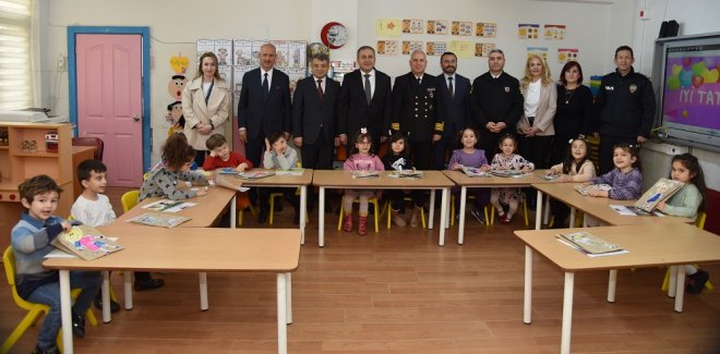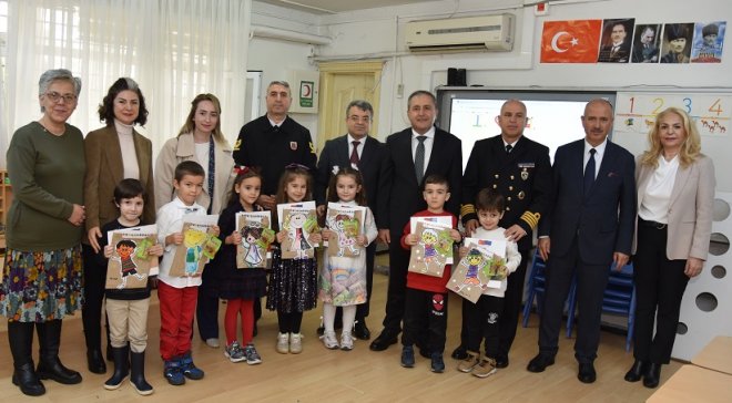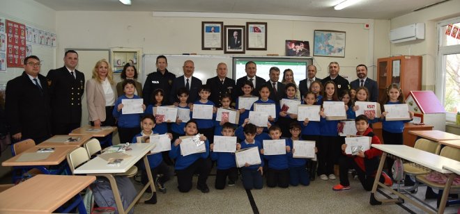 Özel sınıftaki hafif otizmli 1 sınıf öğrencisi Çağan Sopa’nın karnesini ve hediyesini Kaymakam Demir verirken, Ege Deniz Bölge Komutanı Dz. Kd. Albay Ertan Engerek te komutanlığın adının yer aldığı şapkayı takarak birlikte hatıra fotoğrafı çekti.