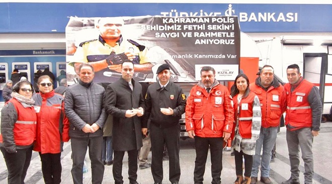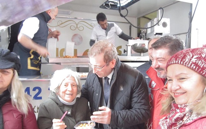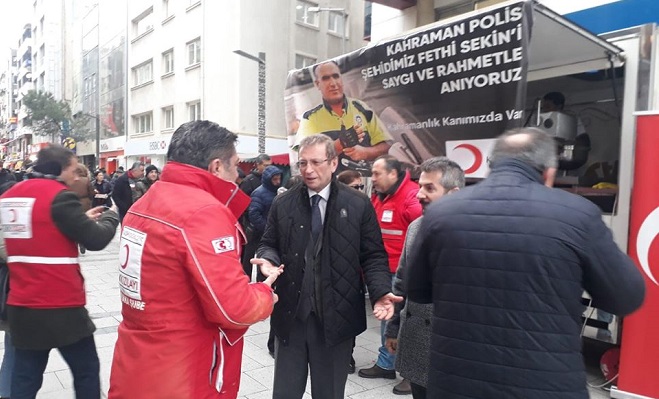Karşıyaka Çarşı Girişinde Fethi Sekin ve şehitlerimiz anısına lokma dökülürken, Karşıyaka Kaymakamı Ali Rıza Çalışır halka lokma dağıttı.