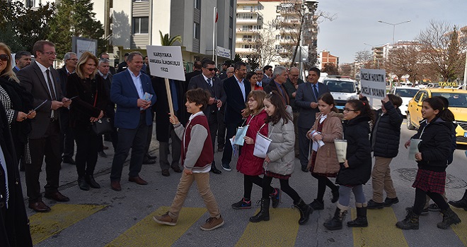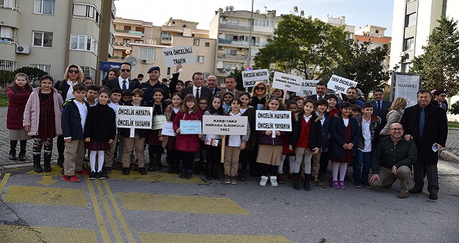 Yaya öncelikli trafik bilincinin yaygınlaştırılması için Karşıyaka Emniyet Müdürlüğü önündeki trafik ışığı olmayan yolda Karşıyaka Kaymakamı Ali Rıza Çalışır, İlçe Emniyet Müdürü Kaan Coşkun, İlçe Jandarma Komutanı Ahmet Karaman, kurum ve okul müdürleri ile öğrenciler bir araya geldi.