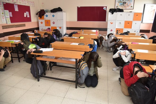 Yüzlerce öğrencinin katıldığı tatbikatta, deprem alarmı verilmesinin ardından, o sırada sınıflarında bulunan öğrenciler, sınıflardaki masaların altına elleri ile kafaları koruyarak saklandı. Daha sonra bulundukları yerleri hızla terk ederek bahçeye çıktı. Bahçede toplanan öğrencilere Okul Müdürü Özcan Bakır depremden korunma tedbirleri ile ilgili bir konuşma yaptı. Daha sonra öğrencilere hitap eden Karşıyaka Kaymakamı Ali Rıza Çalışır, Türkiye’nin birinci derecede deprem kuşağında bulunması dolayısıyla, depreme her zaman ve her yerde hazırlıklı olunması gerektiğini ifade ederek, buna okullarında eğitim gören öğrencilerin de dahil olduğunu ve bu yüzden tatbikatların gerçekleştirildiğini söyledi.