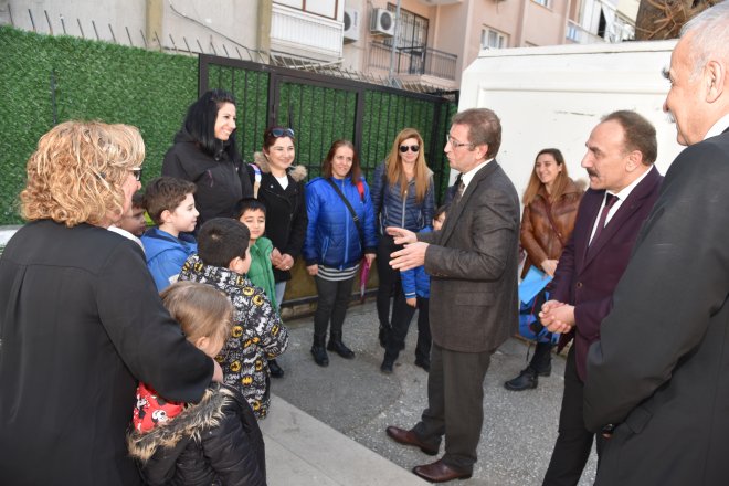 Karşıyaka Kaymakamı Ali Rıza Çalışır ve İlçe Milli Eğitim Müdürü Mustafa İslamoğlu’nu ziyaretlerinde Karşıyaka Selçuk Yaşar Alaybey Ortaokulu Müdürü Abdullah Aycan, Fevzi Paşa Ortaokulu Müdürü Sedat Kale, Türkbirliği İlkokulu Müdürü Affan Arif Erol karşıladı.