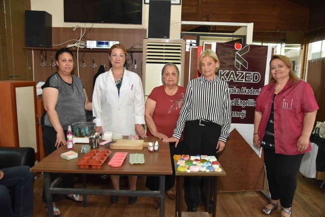 KAZED Başkanı Tülin Topuzoğlu çalışmaları Yaşar Avcı Eğitim Atölyesinde sürdürdüklerini belirterek şunları söyledi: “İŞKUR ve Halk Eğitim ortaklığı ile hafif düzeyde zihinsel engellilere yönelik altı ay süren kursumuzda çocuklarımız sabun yapmayı öğrendiler. Kurs süresince 40 kilo kadar rengarenk sabun Kes-Erit-Dök tekniği kullanılarak çeşitli şekil ve kokularla sabun üretimi gerçekleştirildi.