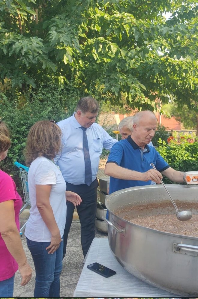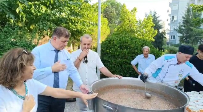 Belediye Başkanı Dr. Cemil Tugay, İlçe Müftüsü İsa Gürler ve Muhtar Hanımşah Han aşure kazanın başına gerek mahalleliye aşure dağıttı.