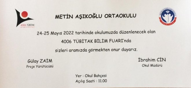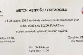 Metin Aşıkoğlu Ortaokulu'nun gelenekselleşen TÜBİTAK Bilim Fuarı yarın (24 Mayıs 2022 Salı) öğrencileri, öğretmenleri, davetlileri ve velilerinin huzuruna açılacak.