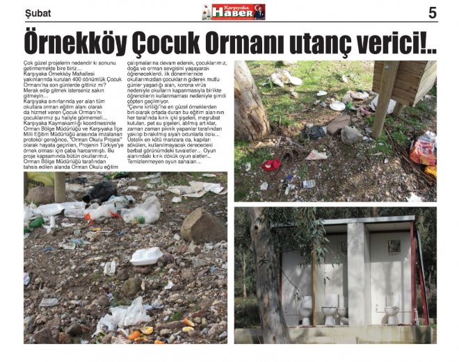 Karşıyaka Kaymakamlığı koordinesinde Orman Bölge Müdürlüğü ve Karşıyaka İlçe Milli Eğitim Müdürlüğü arasında imzalanan protokol gereğince, “Orman Okulu Projesi” olarak hayata geçirilen, Projenin Türkiye’ye örnek olması için çaba harcanmıştı. Bu proje kapsamında bütün okullarımız, Orman Bölge Müdürlüğü tarafından tahsis edilen alanda Orman Okulu eğitim çalışmalarına devam ederek, çocuklarımız, doğa ve orman sevgisini yaşayarak öğreneceklerdi. ilk dönemlerinde okullarımızdan çocukların giderek mutlu günler yaşadığı alan, korona virüs nedeniyle okulların kapanmasıyla birlikte öğrencilerin kullanmaması nedeniyle şimdi çöpten geçilmiyor.