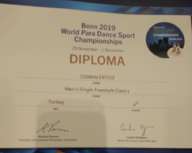 Pantneri Yesim Eryigit ile birlikte Milli Takımımız adına çiftlerde katıldığı Bonn 2019 Wold Para Dances Sport Championships da (Bonn 2019 Wold Para Dansları Spor Şampiyonası) başarılı sonuçlara imza atan Osman Ertöz (Ossi) başta gurbetçilerimiz olmak üzere seyirciler tarafından büyük beğeni topladı.