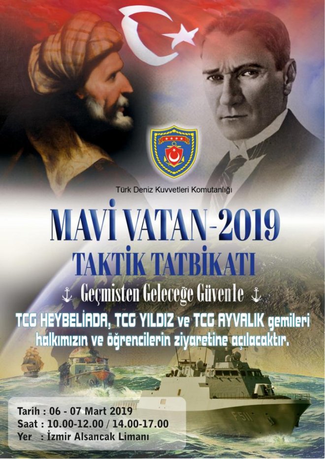 Türk Deniz Kuvvetleri Komutanlığının Mavi vatan -2019 tatbikatına katılacak olan TCG Heybeliada, TCG Yıldız ve TCG Ayvalık gemileri 6-7 Mart arasında saat 10-12 ve 14-17 arasında İzmir Alsancak Limanında demirlenecek ve halka ve öğrencilerin ziyaretine açık olacak.