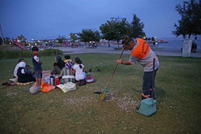Bostanlı sahil bölgesinde gerçekleştirilen etkinlik, dün saat 21.00 sıralarında Balıkçı Barınağı’ndan başladı. Organizasyona Başkan Cemil Tugay ve Genel Sekreter Buğra Gökçe ile birlikte, İzmir Büyükşehir Belediyesi ve Karşıyaka Belediyesi’nin bürokratları, zabıta ve temizlik ekipleri de katıldı. Sahilde oturan vatandaşlara çekirdek ve kuruyemiş atıkları için kese kağıtları dağıtılırken, çevre kirliliğine karşı duyarlılık çağrısı yapıldı.