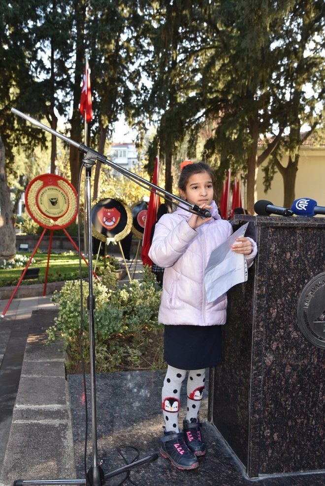 Karşıyaka Kaymakamı Özkan Demir, Karşıyaka Belediye Başkanı Cemil Tugay, siyasi partilerin ve sivil toplum örgütlerinin temsilcileri anıta çelenk konulmasıyla başladı. Saygı duruşunda bulunulması ve İstiklal Marşı’nın okunmasının ardından Türk Anneler Derneği Karşıyaka Şube Başkanı Feyza Işıklı ve Türk Kadınlar Birliği Karşıyaka Şube Başkanı Mehpare Özbakan birer konuşma yaptı, Zübeyde Hanım İlkokulu 4G sınıfı öğrencisi Beril Serdar’ın törende okuduğu şiir duygu dolu anlar yaşattı.