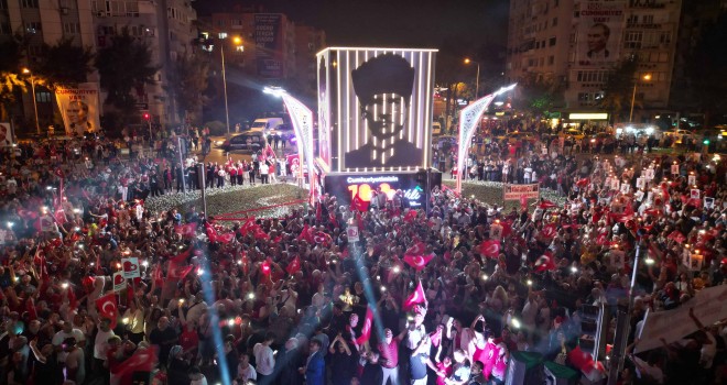 Sakarya Caddesi ile Alija İzetbegoviç caddelerinin kesim noktasına gelindiğinde ise coşku ikiye katlandı. 100’üncü yıl anısına hazırlanan dev Atatürk Anıtı görkemli bir törenle hizmete açıldı. Binlerce vatandaşın şahit olduğu açılış töreninde havai fişek gösterileri, ışık oyunları ve DJ performansı sergilendi. Başkan Sandal, açılış kurdelesini gaziler ile birlikte kesti. Atatürk Anıtı, vatandaşlar tarafından da beğeniyle karşılandı. Yüzlerce Bayraklılı, anıtın önünde hatıra fotoğrafı çektirdi.