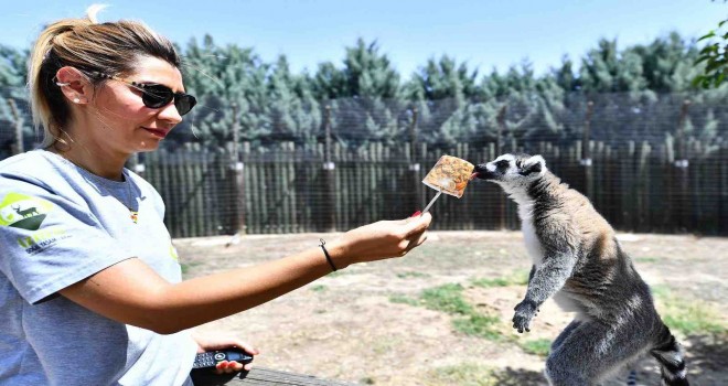 İzmir Büyükşehir Belediyesi’nin 425 bin metrekarelik alan üzerine kurduğu Doğal Yaşam Parkı’nda hava sıcaklıkların artması ile birlikte hayvanların beslenmesinde serin menüye geçildi. Buz kalıplarında dondurulan meyveler, park sakinlerinin serinlemesi için alternatif olarak sunuluyor. Halka kuyruklu lemurlar için de fındık, dut, kayısı ve badem gibi besinler buz kalıplarında dondurularak servis ediliyor. Park sakinleri, buzlu meyveleri yiyerek serinliyor.