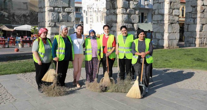 Efes Selçuk sokaklarını süpürgeleriyle temizleyecek kadınlar; “İşin kadını erkeği yoktur. Temiz bir Efes Selçuk için hep birlikte el ele çalışacağız” dediler.