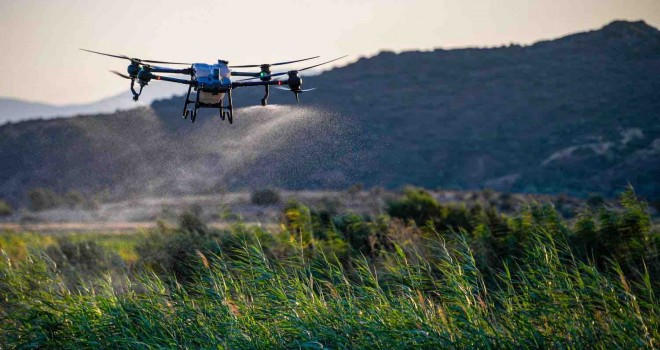 İzmir Büyükşehir Belediyesi Çevre Koruma ve Kontrol Dairesi Başkanlığı Vektör Mücadele Birimi, 30 ilçede 12 ay boyunca sinek ve haşereye karşı üreme alanlarında çalışmalarını aralıksız sürdürüyor. Küresel iklim krizi ve değişen yağış rejimi nedeniyle artan sivrisinek popülasyonuna karşı yoğun bir mücadele veren ekipler yaklaşık 300 bin noktada ilaçlama yapıyor. Sivrisinekle mücadelede en etkili ve hızlı sonucu almak için insan ve makine gücünün ulaşamadığı bölgelerde günün teknolojisi ile desteklenen ilaçlama yöntemleri kullanılıyor. Sivrisineklerin en çok ürediği ve rüzgarın da etkisiyle kent merkezine taşındığı bölgelerden biri olan Gediz Deltası’nın Foça Bağarası ile birleştiği bölüm ile Küçük Menderes Havzası’nda bulunan Selçuk Pamucak’ın bir bölümünde zirai dron aracı ile biyolojik larvasitler kullanılarak ilaçlama yapılıyor. Kapasitesi 40 litre olan ve saatte 213 dekar ilaçlama yapabilen dron ekiplere büyük kolaylık sağlıyor.