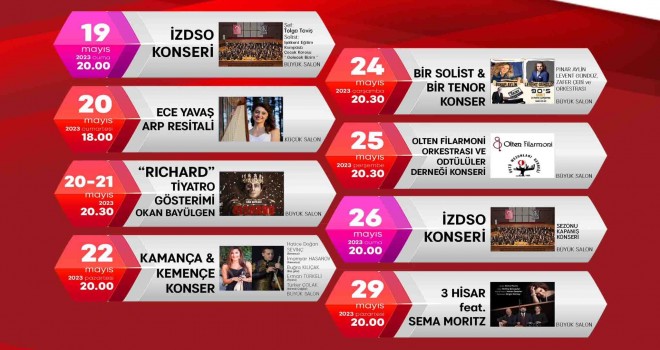 İzmir Devlet Senfoni Orkestrası 5 Mayıs’ta Büyük Salon’da şef Cem’i Can Deliorman’ın yönetiminde konser düzenleyecek. 12 Mayıs Cuma günü ise İzmir Devlet Senfoni Orkestrası, Büyük Salon’da saat 20.00’de şef Holly Choe yönetiminde sanatseverlerle buluşacak. Konsere katılmak isteyenler www.biletinial.com ya da İZDSO gişelerden biletlere ulaşabilir.