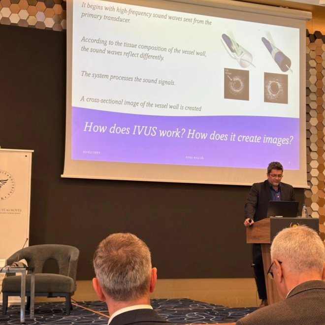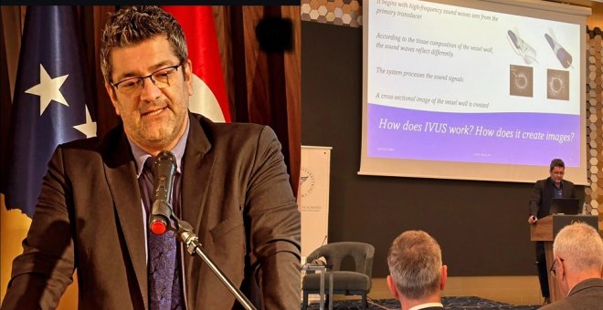 Ertesi gün ise Başkent Priştinadaki Kosova Girişimsel Kardiyoloji kongresinde Çiğli'deki hastanede düzenli olarak uygulanan kompleks koroner girisimsel işlemlerde damar içi görüntüleme (ivus) ve plak modifikasyon teknikleri (rotablator, cutting balon, scoring balon, litotripsi) konularında sunum yapıldı, çeşitli oturumlarda da görev alınarak Kosova, Slovenya, Luxemburg ve Arnavutluktan meslektaşlarımız ile bilgi ve deneyimler paylaşıldı. Ziyaret sırasında Kosova televizyonuna ziyaretin amacı ve anjiyografi işlemleri ile ilgili bir röportaj da verildi. Dost ve kardeş ülkemiz Kosovaya kalp sağlığı ve tedavileri konusunda Bakırçay Üniversitesi Tıp Fakültesi Çiğli Eğitim ve Araştırma Hastanesi Kardiyoloji Anabilim Dalı olarak desteklerimiz devam edecektir.