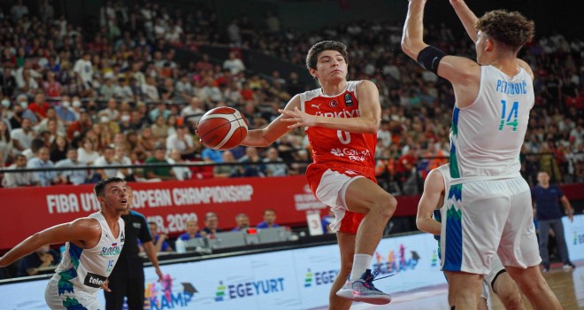 Mustafa Kemal Atatürk Karşıyaka Spor Salonu’nda oynanan karşılaşmanın ilk yarısını millilerimiz 43-39 geride tamamladı. 18 Yaş Altı Erkek Milli Takımımızda Karahan Efeoğlu 20, Berke Büyüktuncel 19 ve Arda Sivas 14 sayı kaydetti. Slovenya’da ise Arne Osojnik 14 sayıyla oynadı. Millilerimiz finalde 20.30’da İspanya ile karşılaşacak. Müsabaka TRT Spor Yıldız’dan naklen yayınlanacak.