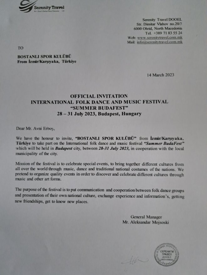 Bostanlıspor Başkanı Avni Erboy, daha önce KKTC’de uluslararası oryantiring şampiyonasına katıldıklarını, kardeş kuruluş Karşıyaka Sanat Derneği Türk Müziği Korosu ile Bulgaristan’da “Uluslararası Korolar Festivali”nde yer aldıklarını ifade ederek “Bu kez Budapeşte’den gelen Halk Oyunları festival davetini kabul ettik. 28-31 Temmuz tarihlerinde festivalde ülkemizi başarıyla temsil etmek istiyoruz. Hazırlıklarımız sürüyor. Organizasyonun genel müdürü Aleksandar Mojsoski ülkemizden bizi davet ettiği için kendisine teşekkür ederim. Festival tarihinde Masa Tenisi erkek ve kadın takımlarımız da Budapeşte takımlarıyla ikili karşılaşmalar yapacak. Daha sonra Bulgaristan ve Kuzey Makedonya’dan gelen teklifleri değerlendireceğiz” açıklamasını yaptı.